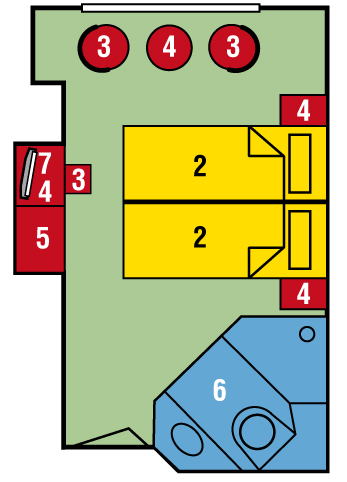 Все каюты на главной палубе — с большими, не открывающимися, панорамными окнами. площадью около 15 квадратных метров, оснащены душем и туалетом, индивидуальным кондиционером, феном, сейфом, спутниковым телевидением. Каюты оформлены в элегантном стиле. В каюте либо одна двуспальная кроватью либо две раздельные кровати, которые можно поставить вместе.