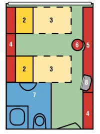 Каюты все 2‑х местные с французским балконом, площадью около 13 квадратных метров, с двумя кроватями. Есть индивидуальный пульт управления кондиционером, душевая кабина, туалет, фен, внутренний телефон и спутниковое ТВ. В течение дня одну кровать можно сложить, чтобы создать более уютную атмосферу.