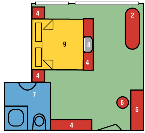 2‑местный делюкс — около 24 квадратных метров с двуспальной кроватью и диваном. Есть индивидуальный пульт управления кондиционером, душевая кабина, туалет, фен, внутренний телефон и спутниковое ТВ.