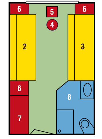 Каюты площадью около 11 квадратных метров с французским балконом. Все каюты имеют две раздельные кровати, одна из которых убирается, в то время как другая - удобный диван. Есть индивидуальный кондиционер, душ и туалет, фен, музыкальный канал.