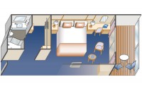 В каюте: 2 кровати, которые могут быть конвертированы в одну, сейф, телевизор, ванная комната, кондиционер, фен, мини-бар, гардеробная, столик и стулья на балконе.