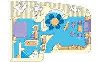 В каюте: в спальне две кровати (объединяются в одну кровать queen-size) туалетный столик, отдельная гостиная с диваном, обеденным столом, ванная комната с душем и ванной, гардеробная, 2 телевизора, компьютер, CD/DVD-плеер, барная стойка с местом для приготовления коктейлей, холодильник, свежие цветы. На балконе: шезлонги, столик и стулья из тикового дерева.