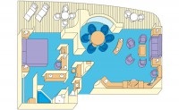 В каюте: в спальне две кровати (объединяются в одну кровать queen-size) туалетный столик, отдельная гостиная с диваном, обеденным столом, ванная комната с душем и ванной, гардеробная, 2 телевизора, компьютер, CD/DVD-плеер, барная стойка с местом для приготовления коктейлей, холодильник, свежие цветы. На балконе: шезлонги, столик и стулья из тикового дерева.