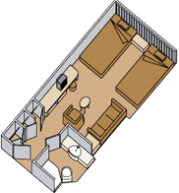Две одноместные кровати или одна двуспальная, ванная комната с душем. Все каюты категории DD имеют окно с ограниченным видом на океан. Категории HH имеют полностью ограниченный вид из окна. В каютах категории E, F, G и H могут быть вместо окон иллюминаторы. (Категории C, D, DA, DD, E, EE, F, FF G, H, площадь 17 кв.м.).