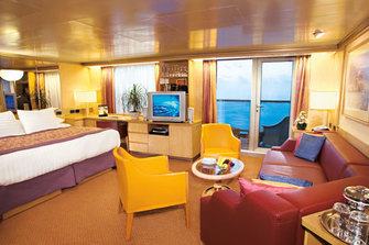 Две одноместные кровати или одна двуспальная, ванная комната, огромная ванна-джакузи, душ, дополнительная душевая кабинка, большая комната отдыха, гардеробная, балкон, диван на двоих человек, панорамные окна. (Категория SA, SB, SC площадь от 47 до 66 кв.м. с балконом).