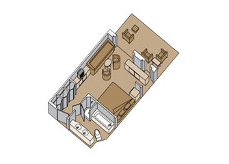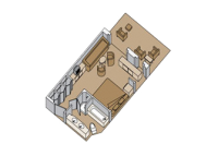 Две одноместные кровати или одна двуспальная, ванная комната с раковиной и туалетным столиком, большая ванна-джакузи, душ, дополнительная душевая кабинка, комната отдыха, гардеробная, балкон, диван на двоих человек, DVD плеер, панорамные окна. (Категории SS, SY, SZ, площадь 36 кв.м., с балконом).