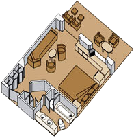 Две одноместные кровати или одна двуспальная, ванная комната с раковиной и туалетным столиком, большая ванна-джакузи, душ, дополнительная душевая кабинка, комната отдыха, гардеробная, балкон, двуспальная кровать, панорамные окна. (Категория SA, SB, SC, площадь от 47 до 55 кв.м., с балконом).