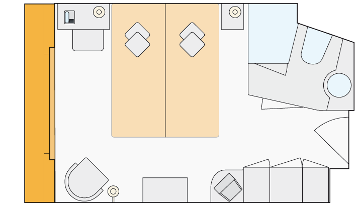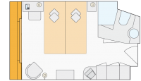 Каюта С - площадь 14,5 кв. м, двуспальная кровать, французский балкон, санузел с душем, гардероб. Расположена на палубе 2.