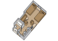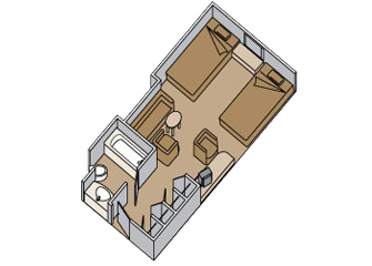 Категории C, D, DA, DD (некоторые с ограниченным видом из окна), E, EE, F, FF, G, H (с иллюминаторами вместо окон), HH (полностью ограниченный вид). Две одноместные кровати или одна двуспальная, ванная комната с душем. Площадь от 16 до 24 кв.м.