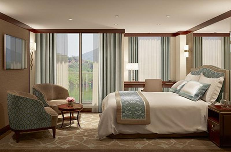 Комфортабельная каюта общей площадью 15 кв.м., обставленная самой изысканной полированной мебелью. Ткани выполнены в теплых, пастельных тонах. Для удобства гостей две односпальные кровати, которые при необходимости можно сдвинуть вместе. В гостиной два удобных кресла и письменный стол. Ванная комната с душевой кабиной, имеются полотенца и средства гигиены. Во всех каютах установлены кондиционер, телевизор с плоским экраном, спутниковое телевидение, фен, сейф, телефон. Имеется все необходимое для приготовления чая/кофе.