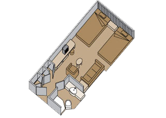 Две одноместные кровати или одна двуспальная, ванная комната с душем. Все каюты категории DD имеют окно с ограниченным видом на океан. Категории H имеют полностью ограниченный вид из окна. В каютах категории G и H могут быть вместо окон иллюминаторы. (Категории C, D, DA, E, EE, F, FF, G, H, площадь от 13 до 30 кв.м.).
