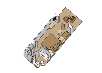 Две одноместные кровати или одна двуспальная, ванная комната с душем, комната отдыха, балкон, панорамные окна. (Категории VA, VB, VC, VD, VE, VF, VH, площадь от 20 до 33 кв.м., с балконом).