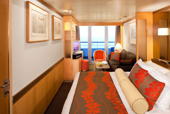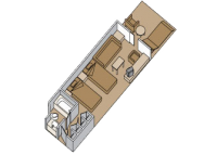 Две одноместные кровати или одна двуспальная, большая ванна-джакузи, душ, зона отдыха, балкон, мини-бар, холодильник, панорамные окна. (Категории A, B, BA, BB, BC, BQ (Спа-каюта), площадь 27 кв.м., с балконом).