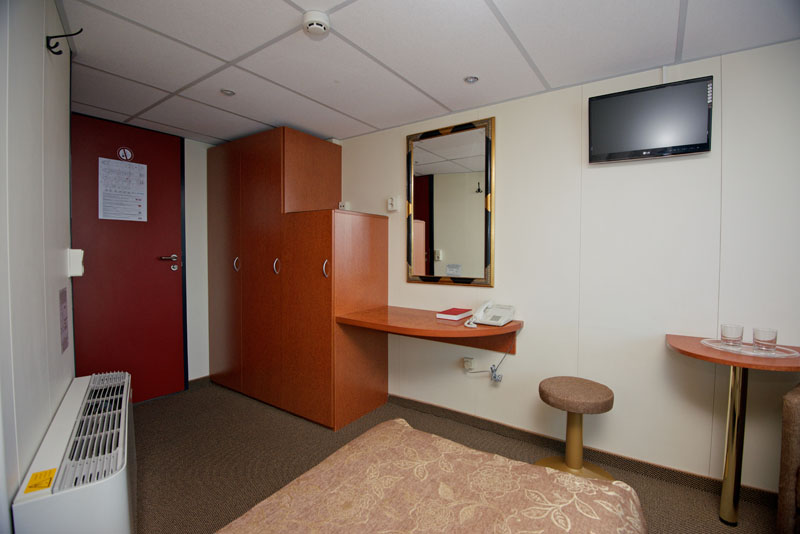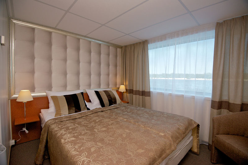 Все каюты на теплоходе — двухместные, площадью 14 кв.м., внешние, с панорамным окном. Окна в каютах не открываются. В каюте имеется: — две односпальные кровати (или одна двуспальная кровать) — санузел с душем — регулируемый кондиционер — просторный шкаф для вещей — туалетный столик с зеркалом — телевизор — телефон — фен Все каюты могут использоваться для одноместного размещения. Некторые каюты на верхней палубе могут быть трансформированы в двухкомнатные каюты-люкс.