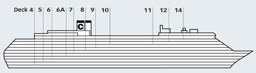 Nabucco палуба 4 Boheme - палуба 5 Traviata - палуба 6 Manon - палуба 6A Carmen - палуба 7 Otello - палуба 8 Tosca - палуба 9 Norma - палуба 10 Rigoletto - палуба 11 Butterfly - палуба 12 Solarium - палуба 14 |