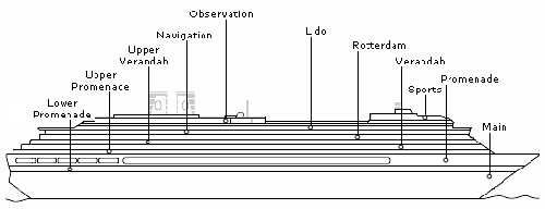 Sports Deck Observation Deck Lido Deck Navigation Deck Rotterdam Deck Upper Verandah Deck Verandah Deck Upper Promenade Deck Promenade Deck Lower Promenade Deck Main Deck |