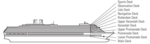 Sports Deck Observation Deck Lido Deck Navigation Deck Rotterdam Deck Upper Verandah Deck Verandah Deck Upper Promenade Deck Promenade Deck Lower Promenade Deck Main Deck |